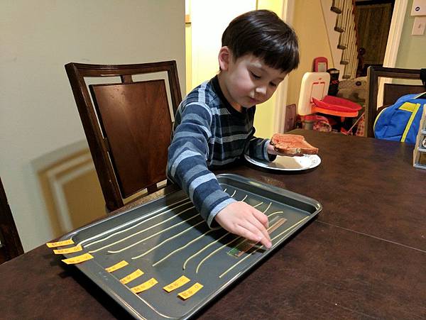 這個實驗也是在我準備晚餐時同時進行。首先,我請喬治幫我按微波爐上的計時器(timer),其實,我覺得教喬治設定計時器是這次實驗最大的收穫。這是他第一次設定計時器,這讓他學到「分」與「秒」的概念。所有的麵條排好後,喬治一看到不一樣長度的麵條,就說他要量麵條長度。但他把伸縮量尺拉壞了,只好用直尺量(是的!要讓小孩玩工具,必需要有心理準備,東西不是弄壞就是弄丟)。仔細想想,用直尺量長度也不錯,國小一、二年級的小朋友,可以順便練習加法。喬治邊吃東西邊玩「量麵條」的遊戲,一旁的我忙著準備食物,清理被妹妹亂丟的食物,洗碗盤等等,等我回過頭要來量麵條時,它們已經乾掉而且變得彎彎曲曲了。該如何量彎掉的麵條呢?這也很有趣,可以請小朋友一起動動腦。不過,因為沒量到剛煮好的麵條的長度,媽媽又得再想辦法改進這個義大利麵條實驗了。這個改良後的實驗就記錄在「義大利麵裡的科學(小學版)」裡。