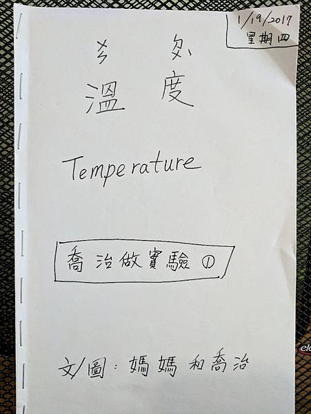 這是喬治未滿四歲時,我們一起做的書/實驗。當時,他的語言,不管是中文還是英文,都明顯落後同齡的小朋友。因為他喜歡看書,我們做了很多書。目的不是為了教他任何科學知識,而是為了教他使用語言。 這個實驗很有趣,兩三歲的小朋友都可以一起做。只要裝一杯較熱的水和一杯冰冰的水,讓孩子摸或喝,然後在將兩杯水倒入一個空杯中,讓孩子體驗溫度的變化。當時喬治還滿喜歡這個活動的 。做這一本「溫度」書也很簡單,只要二十分鐘,將A4紙張對折,將幾張紙裝訂起來就好了。我用很快的速度完成,字本來就醜,寫得快就更醜了。但我發現如果我太在意細節,這些書就無法完成了。我喜歡讓喬治看我寫字畫圖,但我不勉強他畫。我會邀請喬治幫忙完成書,比如我會請他著色。在書封面寫上喬治的名字,也讓他對於這本書產生特別的感情。直到今天,他還是會偶爾翻翻這本書。這時,我會請他看看書上的注音或國字。如果你的孩子有語言發展的問題,以孩子有興趣的主題,畫些簡單內容或貼上照片,然後跟孩子一起讀,是語言治療師會推薦的方法喔。