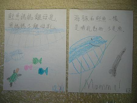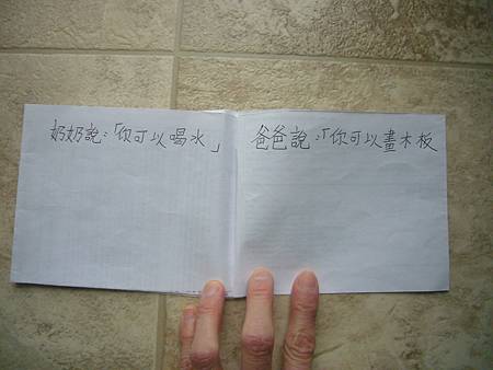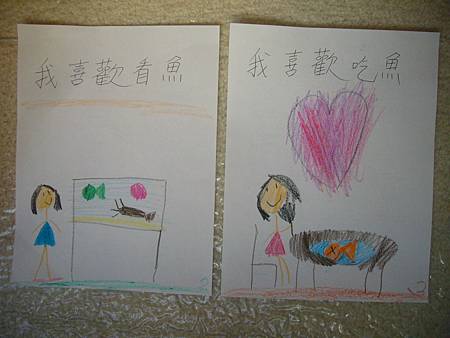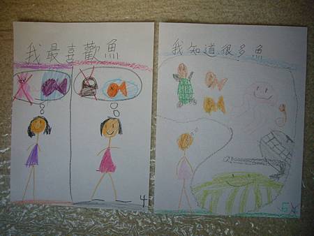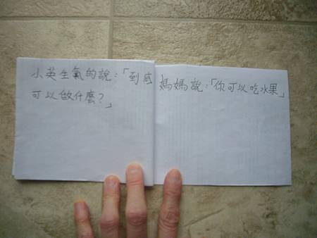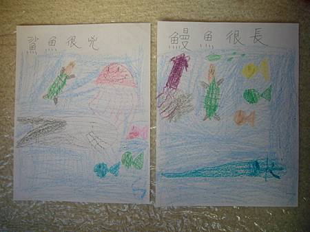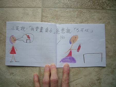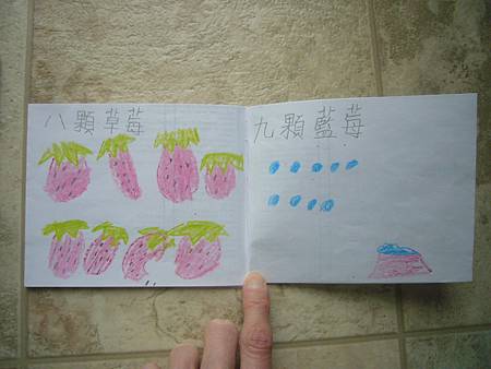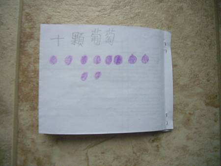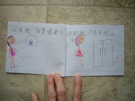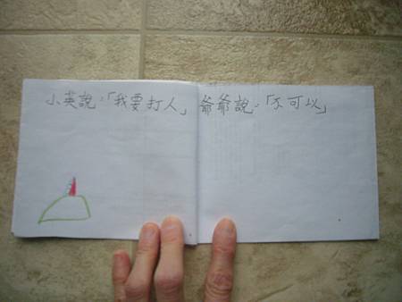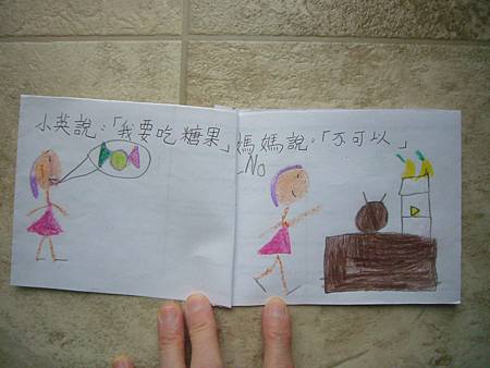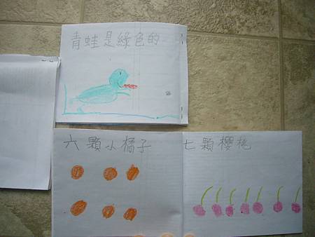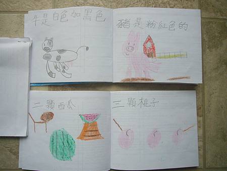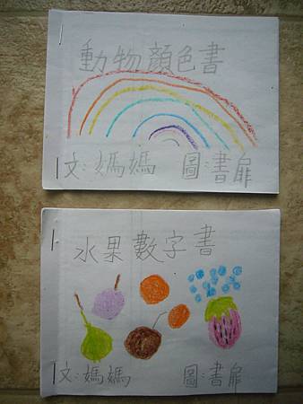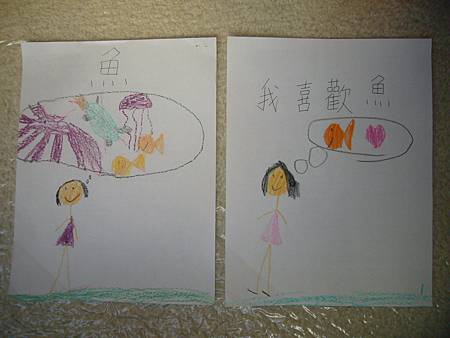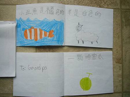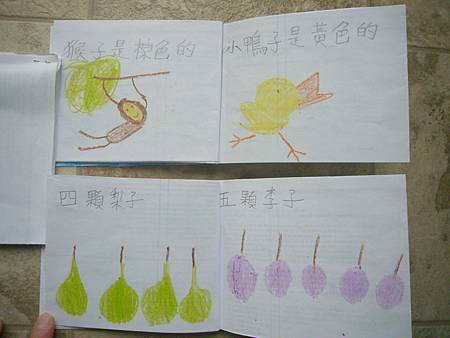 當書扉剛開始學中文識字,我們用中文配對卡讓她學會了一些字,玩膩中文配對卡後,也試著將字卡導入日常的餐廳等遊戲,但是這些都是分散的單詞,想要讓她認識更多字以及組成句子的字,就必須再嘗試其他辦法。在我想到使用每天寫超短中文日記的方法之前,我們曾經試著一起做中文書,由媽媽寫字,書扉畫插圖,因為媽媽不太會畫圖,而且讓書扉畫圖她能有參與感,自己做的書應該會更有興趣讀吧,我是這麼想的。所以我試著寫了數字水果書,因為數字和水果書扉都學了,只是如果不持續複習又會忘記,雖然家中有類似的寶寶書,但書扉已經沒興趣翻了,如果自己做的書也許可以讓她更有興趣讀,就算是複習學過的字也很好。這本書完成後宇昕也挺喜歡的,家中現成的寶寶書雖然印刷精美,反而沒有這麼吸引她,所以在學了顏色的中文字後,我寫了動物顏色書,動物圖案比較困難,書扉當然畫不出專業水準,好在妹妹挺賞臉的,剛做好時翻了好些日子。因為反應不錯,就試著做有句子的書,第一本也最成功的是<魚>,因為書扉很愛看魚和吃魚,就挑她愛的題材,這本宇昕不知為何也很喜歡,首先嘗試寫了五頁超簡單句子,後來因為反應好就試著增加頁數。不過之後再嘗試要做<可以不可以>時,書扉已經沒有新鮮感了,所以沒能完成所有的插圖,但是因為文句簡單,宇昕倒是挺喜歡的,陸陸續續再拿出來讀,反而是姊姊通常畫完插圖就沒再翻了,所以其實變成教妹妹的自製中文書。不過構思簡單的書,讓書扉有興趣參與製作,更重要的是有興趣讀的計畫似乎不太成功,所以又試著想其他方法,後來就有寫中文日記的方法,因為容易多了,所以能持續進行,就比較少一起做中文書了,雖然媽媽也再嘗試過寫一些短故事,但都沒能讓書扉有興趣,結果我們就很少一起做書,不過書扉還是三不五時自己創作英文圖畫書。