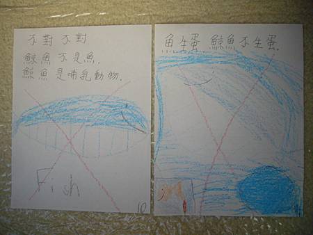 書扉用叉叉表示不對或不是,所以她寫了魚,再畫上叉叉表示不是魚,這幾頁都是這樣的表達方式,這種構圖大概只有媽媽能看懂