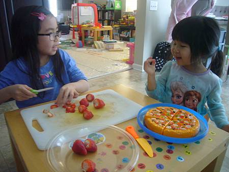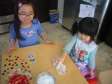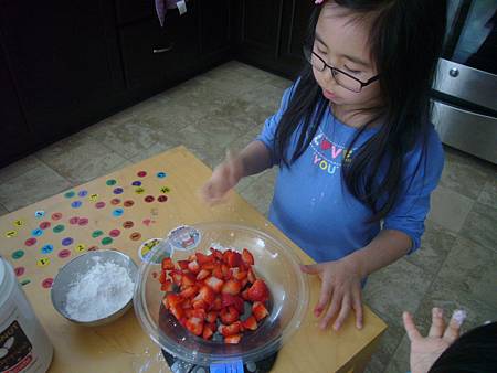 星期六早上書扉看到快樂版巧虎書上的做果醬單元,就問媽媽可不可以自己做果醬,我印象果醬只需要水果和糖,材料家中都有,就讓孩子玩玩看,於是找出冰箱剩下的九顆草莓,兩個小朋友幫忙摘掉果蒂上的葉子,在流理台清洗草莓,因為太矮都得站在矮凳上,宇昕還差點摔下來,所以就搬了平常畫圖寫字的小桌子到廚房,讓他們繼續後續工作,包括切草莓秤重量加糖粉等,最後放上爐子煮了半小時,真的做出很新鮮好吃的草莓果醬,不過因為材料只有九顆草莓,午餐後吃了一點當點心,就只剩下幾個小茶匙的量,從準備到煮好完成前後花了近兩小時,做出來的分量竟然只夠抹三片麵包左右,真是有點搞笑,不過成果比預期的好,小孩也玩得很開心。書扉還自信滿滿的說下次要教阿姨做果醬哪。