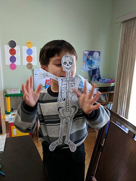 「戴帽子的貓」這套影集主要是以自然科學知識為主,媽媽覺得影片很有趣,內容也很豐富,可以學到很多知識。最近,喬治喜歡上其中一集「骨頭好好玩」(YouTube上有人放英文版「Jiggle Bones」。這集影片的內容是戴帽子的貓帶主角尼克及莎莉去找咯咯笑醫生,因為他們想了解為什麼人身體內有那麼多骨頭。咯咯笑醫生問尼克及莎莉知不知道哪根骨頭是「笑笑骨」(Funny Bone,關於何謂「笑笑骨」,請看中文介紹及英文介紹),喬治就是因為「笑笑骨」這個詞而愛上這集影片(而且喬治也誤以為「屁股」也是骨頭)。後來,我突然想到家裡有「小天下」出的「原來科學這麼好玩」這本書,書裡有「製作活動骨架」這個剪貼活動,於是請爸爸幫我們影印三份,然後又去美勞用品店買可以將兩張紙結合起來但紙張還能活動的特殊別針。媽媽負責將紙上的骨頭剪下來,原本並沒有打算請喬治黏貼,但他自己就黏起來了,亂黏一通,最後還把成品貼在自己的額頭。他玩得很開心,媽媽就開心了。將喬治做的骨架跟媽媽做的骨架放在一起,希望他哪天想到可以稍微注意一下兩個骨架的差異。