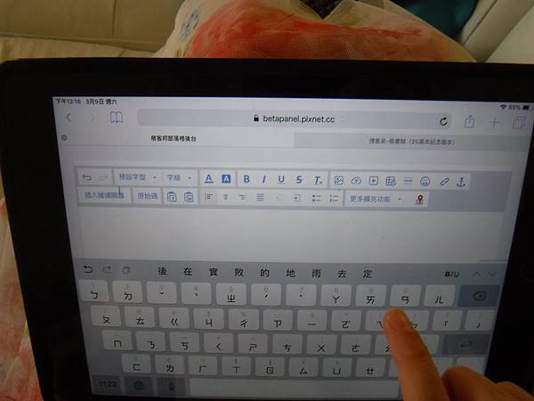 我讓書扉用Ipad打字,因為我們家的電腦沒有安裝中文輸入也沒有標注音的鍵盤。Ipad的注音輸入可以看到所有注音符號和聲符,很方便使用。書扉學過注音符號,但因為我沒有不斷讓她持續練習,某些拼音還不能掌握得很好,但大致上可以拼出想用的字。而Ipad的注音輸入拼了音就會自動列出一排同音的常用字,可以從中選字,甚至選字後還會列出該字常連接的下個字,也就是連語詞都可以透過認字選出,不見得需要拼出所有字音,這也讓對注音不夠熟練的書扉更容易做中文打字。儘管如此,還是需要自己拼很多字音,所以書扉的第一個困難是,有些拼音仍無法正確拼出,一部份是因為她對注音不夠熟練,一部份則是因為我的發音其實不完全精確符合,所以她用學到的不正確發音無法正確拼出注音,例如,她要拼「什麼」時打了「ㄕㄜˊ」,正確拼法是「ㄕㄣˊ」,前面那個發音其實是我慣常的發音,她也跟著學起來,所以就拼不出來,我則是因為基本上記得正確拼音,雖然唸不正確,卻可以正確地打出拼音。在她打不出字向我求救時,我也才察覺這個發音問題。不過我自己長年習慣的發音很難改正,只能讓她像我一樣背下正確拼音。